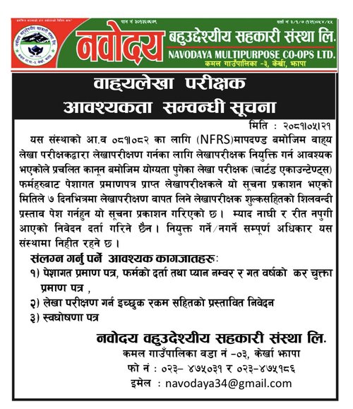 यस संस्थाको आ.व० ८१।०८२ का लागि (NFRS)मापदण्ड वमोजिम वाह्य लेखा परिक्षकद्धारा लेखापरीक्षण गर्न लागि लेखा परिक्षक नियुक्ति गर्न आवश्यक भएकोले प्रचलित कानुन वमोजिम योग्यता पुगेका लेखा परिक्षक (चार्टड एकाउन्टेण्ट्स) फर्महरुवाट पेशागत प्रमाणपत्र प्राप्त लेखापरीक्षकले यो सुचना प्रकाशन भएको मितिले ७ दिन भित्रमा लेखापरीक्षण वापत लिने लेखापरीक्षक शुल्क सहितको शिलवन्दी प्रस्ताव पेश गर्नहुन यो सुचना प्रकाशन गरिएको छ । म्याद नाघी र रीत नपुगी आएको निवेदन दर्ता गरिने छैन । नियुक्त गर्ने /नगर्ने सम्पुर्ण अधिकार यस संस्थामा निहित रहने छ ।