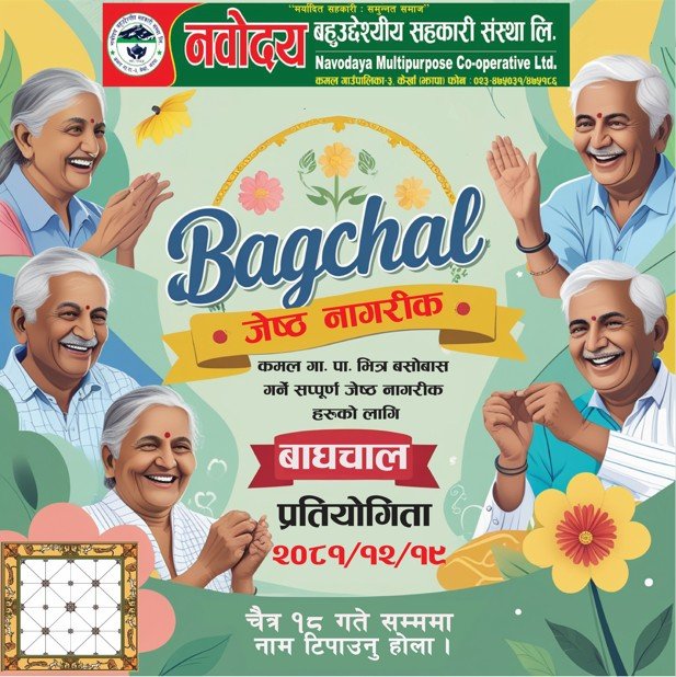 सहकारी दिवसको अवसरमा मिति २०८१/१२/१९ गते मंगलबारको दिन जेष्ठ नागरिकज्यूहरूको लागि बाघचाल प्रतियोगिता राखिएको हुनाले सम्पूर्ण कमल गा.पा. बसोबास गर्ने जेष्ठ नागरिकज्यूहरूले बाघचाल प्रतियोगितामा भाग लिन इच्छुक भएमा मिति २०८१/१२/१८ गते सोमबार ५ बजे भित्रमा फोनकलमार्फत वा कार्यालयमा उपस्थित भएर नाम टिपाउन हुन जानकारी गराइन्छ। ९८०१४३३९०४